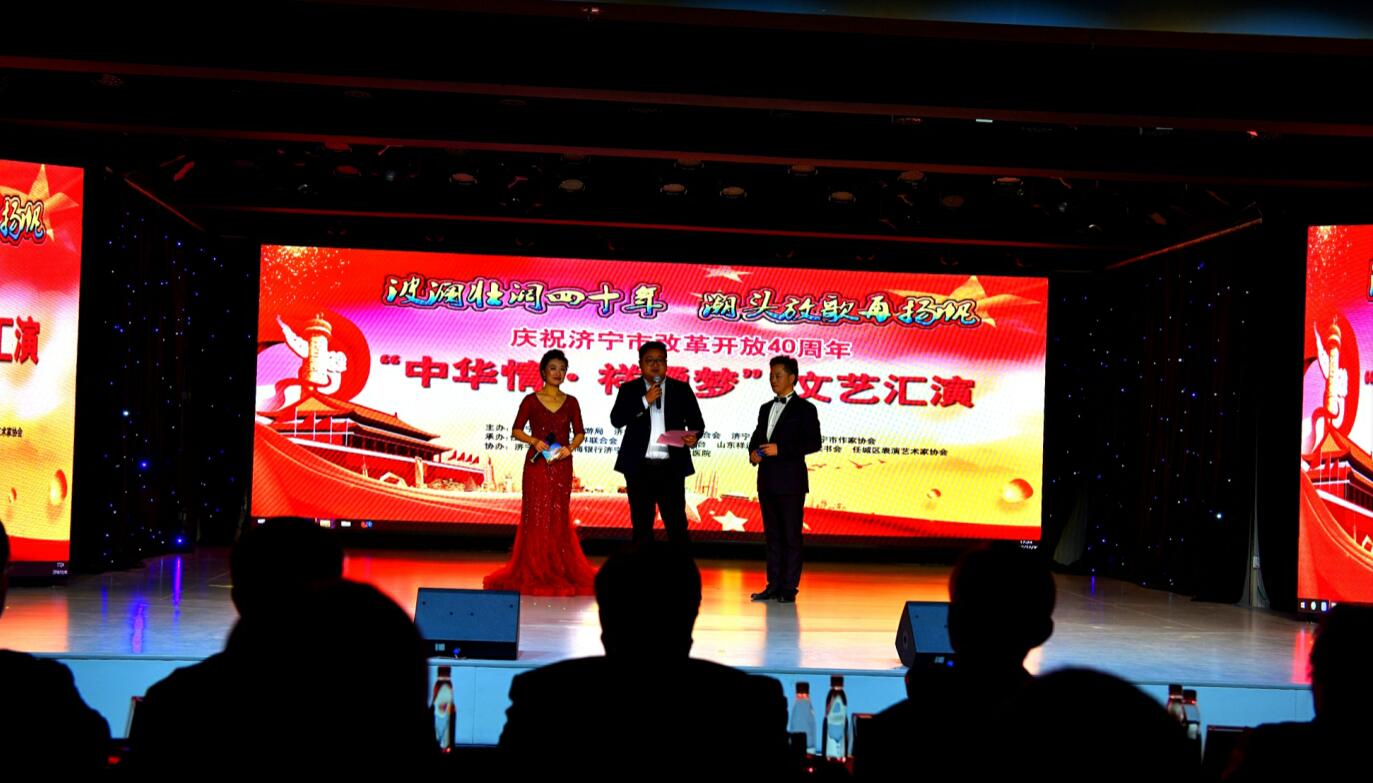 春華秋實(shí)四十載,書(shū)寫(xiě)偉大變革新華章;砥礪奮進(jìn)新時(shí)代,踏上改革開(kāi)放新征程。在全黨全國(guó)上下深入學(xué)習(xí)貫徹習(xí)近平總書(shū)記在慶祝改革開(kāi)放40周年大會(huì)上的重要講話精神之際,12月30日下午,由濟(jì)寧市文化和旅游局、濟(jì)寧市文聯(lián)、濟(jì)寧廣播電視臺(tái)、濟(jì)寧市作協(xié)主辦,任城區(qū)文聯(lián)、任城區(qū)廣播電視臺(tái)、山東祥通集團(tuán)、濟(jì)寧市讀書(shū)協(xié)會(huì)、任城區(qū)表演藝術(shù)家協(xié)會(huì)承辦,濟(jì)寧銀行、威海銀行濟(jì)寧分行、濟(jì)寧博仕醫(yī)院協(xié)辦的濟(jì)寧市慶祝改革開(kāi)放40周年暨“中華情 祥通夢(mèng)″文藝匯演在濟(jì)寧高新區(qū)祥通工業(yè)園內(nèi)六樓祥通新雅多功能演播廳濃情上演。出席文藝匯演的領(lǐng)導(dǎo)有:濟(jì)寧市人大原第一副主任、黨組書(shū)記祝金煥,濟(jì)寧市人大原第一副主任連廣生,濟(jì)寧市人大原副主任許謙迎,濟(jì)寧市人大原副主任殷允嶺,濟(jì)寧市政協(xié)副主席李良品,濟(jì)寧市原市委常委、政協(xié)副主席張開(kāi)朗,濟(jì)寧技工學(xué)院黨委書(shū)記、院長(zhǎng)樊剛,濟(jì)寧市委黨校黨委書(shū)記、常務(wù)副校長(zhǎng)孫琪 ,濟(jì)寧市委宣傳部常務(wù)副部長(zhǎng)孫愛(ài)民,濟(jì)寧市文化和旅游局局長(zhǎng)張弢 ,濟(jì)寧市廣播電視臺(tái)黨委書(shū)記、臺(tái)長(zhǎng)張作昌,濟(jì)寧市文聯(lián)主席周長(zhǎng)征,濟(jì)寧市人大原秘書(shū)長(zhǎng)彭廣含,濟(jì)寧市任城區(qū)人大原副主任張曉平,孔子研究院副院長(zhǎng)陳曉霞,濟(jì)寧市財(cái)政局副局長(zhǎng)王玉留,濟(jì)寧市公安局副局長(zhǎng)喬培戰(zhàn),任城區(qū)武裝部政委溫明強(qiáng),任城區(qū)政府副區(qū)長(zhǎng)趙文衛(wèi),濟(jì)寧市消防支隊(duì)副政委井源,濟(jì)寧威海銀行行長(zhǎng)許占東,濟(jì)寧市作協(xié)主席張建魯,濟(jì)寧市作協(xié)副主席汪林, 山東省書(shū)協(xié)副主席、濟(jì)寧市書(shū)協(xié)主席謝長(zhǎng)偉,濟(jì)寧報(bào)業(yè)傳媒集團(tuán)副總經(jīng)理史忠強(qiáng),任城區(qū)委宣傳部副部長(zhǎng)、任城區(qū)文聯(lián)黨組書(shū)記、主席陸振,任城區(qū)廣播電視臺(tái)臺(tái)長(zhǎng)杜慶學(xué),兗州區(qū)文聯(lián)主席張金鵬,兗州區(qū)音樂(lè)家協(xié)會(huì)主席王曼等特邀嘉賓、社會(huì)各界知名人士代表和祥通一線職工及群眾500多人現(xiàn)場(chǎng)觀看了文藝匯演。