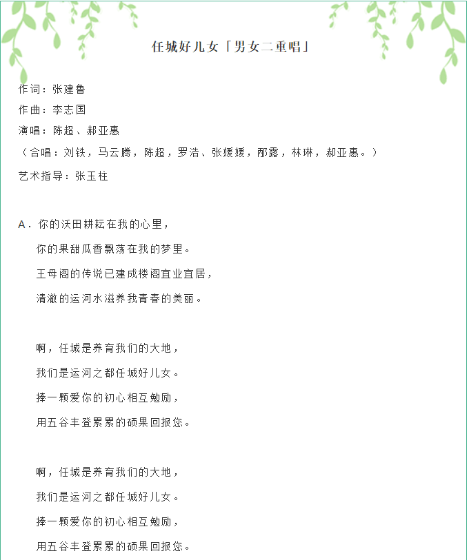 董事長原創(chuàng)作詞歌曲:《任城好兒女》