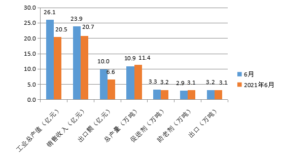統(tǒng)計(jì)數(shù)據(jù)顯示,6月,國內(nèi)橡膠助劑工業(yè)總產(chǎn)值為26.1億元,同比(下同)增長21.45%;銷售收入23.9億元,增長13.38%;出口額10億元,增長34%。
