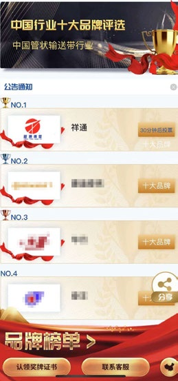 本刊訊 :品牌是一個(gè)企業(yè)無(wú)形的資產(chǎn),也是一個(gè)公司實(shí)力與地位的象征。臨近年末歲尾,山東祥通橡塑科技公司喜報(bào)頻傳:繼祥通牌輸送帶榮獲“山東省優(yōu)質(zhì)產(chǎn)品”后,祥通品牌又榮獲“2019年度中國(guó)管狀輸送帶十大品牌第一名”。2020 年 1 月 21 日,中國(guó)品牌網(wǎng)公布了由該網(wǎng)主辦經(jīng)過(guò)近兩個(gè)月面向全國(guó)消費(fèi)者和廣大廠商的網(wǎng)上投票麟選出的中國(guó)管狀輸送帶行業(yè)的最終評(píng)選結(jié)果,祥通品牌從近100 個(gè)參選品牌中脫穎而出,以638797 票榮獲“中國(guó)管狀輸送帶行業(yè)十大品牌第一名”。還是常言說(shuō)的好:金杯銀杯,不如老百姓的口碑。 這標(biāo)志著祥通品牌建設(shè)又邁上一個(gè)新的臺(tái)階。