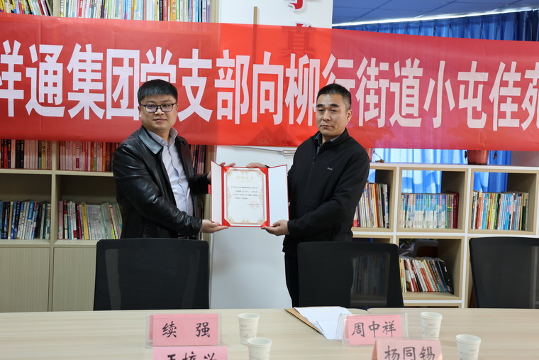 隨后,祥通集團(tuán)黨支部書(shū)記李勉祥向小屯村黨支部書(shū)記王培興同志現(xiàn)場(chǎng)捐贈(zèng)了圖書(shū),柳行街道黨工委委員、宣傳委員楊同錫同志向祥通集團(tuán)總經(jīng)辦主任續(xù)強(qiáng)頒發(fā)了捐贈(zèng)證書(shū)。
